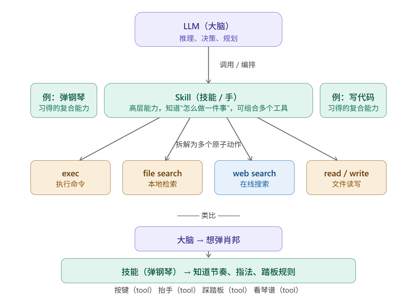 | Skills | 弹钢琴 | 对 Tools 的预定义编排(固定顺序和组合),例如"搜索 + 总结"是一个 Skill |