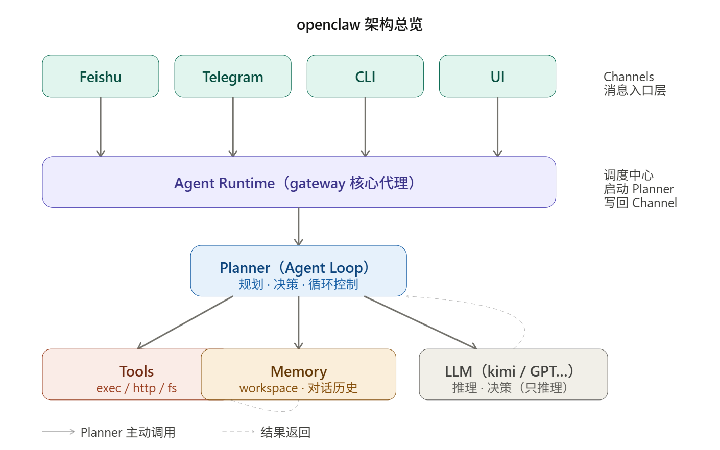 | 06 | LLM 只做推理 | 真正执行在 Tools(exec / http / fs),LLM 不直接操作环境 |