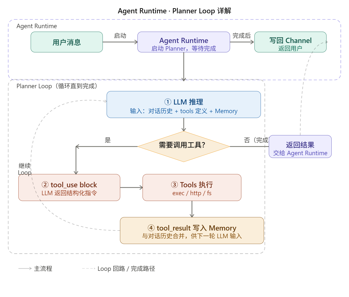 注意:Planner 实现了 Agent Loop,Agent Loop 是 Planner 的运行机制。Tools 和 LLM 都由 Planner 在循环中主动调用,不由 Agent Runtime 直接驱动。