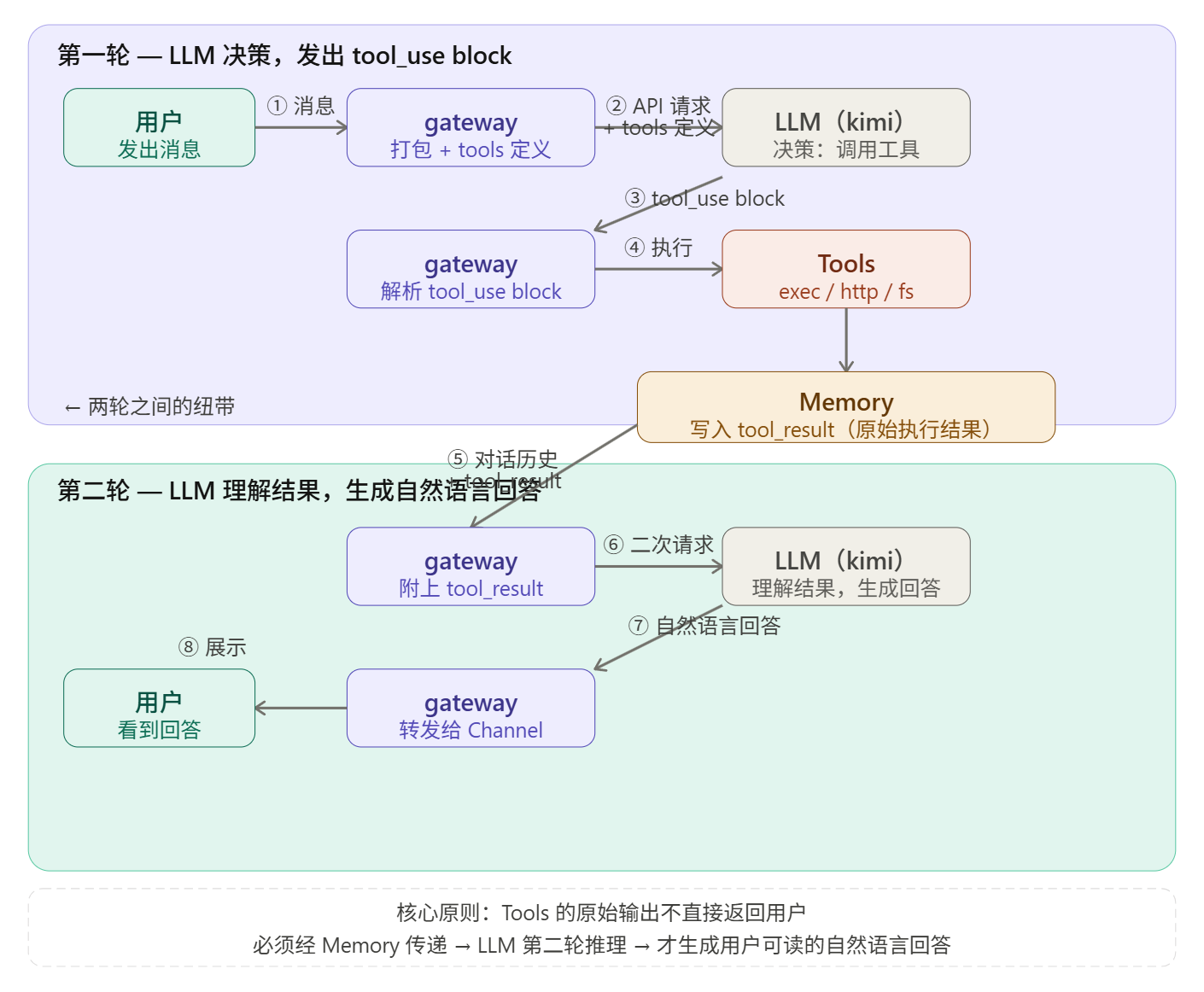 第一轮:gateway 将用户消息 + tools 定义发给 LLM,LLM 返回 tool_use block,Planner 解析后执行 Tool,结果写入 Memory。第二轮:gateway 将对话历史 + tool_result 再次发给 LLM,LLM 生成自然语言回答返回给用户。