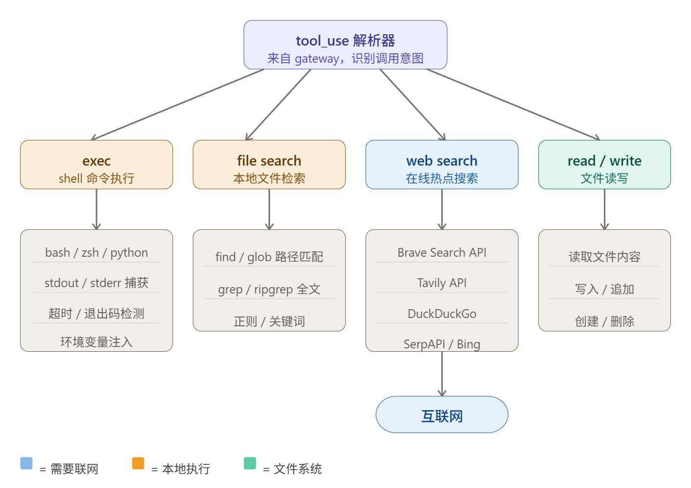 | Tools | exec / http / fs | 实际执行动作的原子能力 |